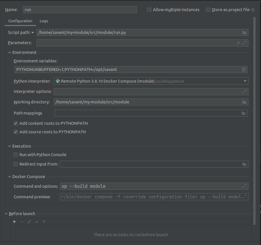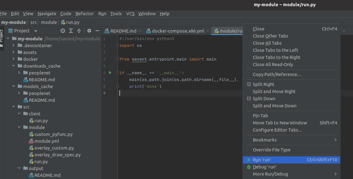 The file run.py is an auxiliary file used as a module entrypoint. Docker images are configure to use it. Also, you use it to run and stop the pipeline from IDE. For production deployments, you normally don’t need it, but you can use it to implement custom code initialization if necessary.