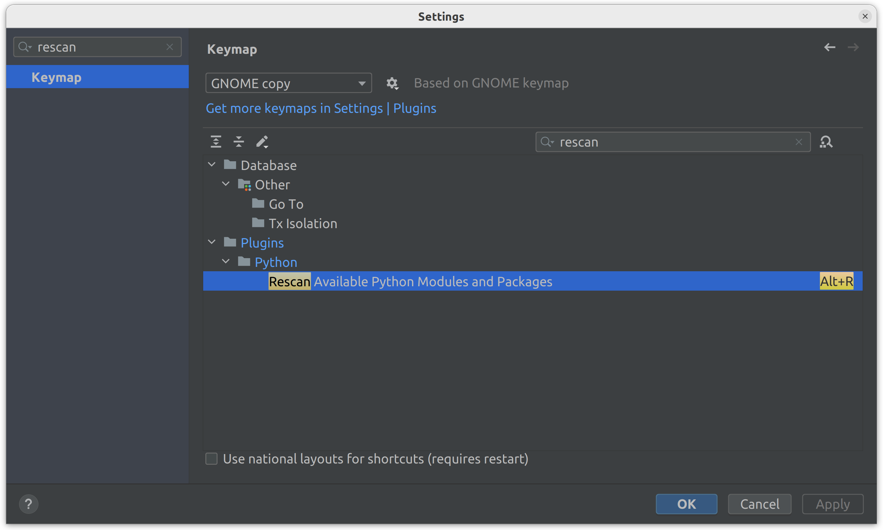 However, PyCharm does not automatically detect newly installed packages in the Docker container. The PyCharm will update the skeleton at the next startup or you can manually scan for new packages. To do this, you need to open the Settings and look for Rescan, then navigate to Plugins > Python > Rescan Available Python Modules and Packages and set the hotkey (e.g., Alt+R):