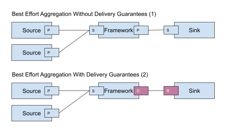 The first pattern can be used when neither adapters nor the module must get stuck because of the sink stalling. The second pattern is beneficial when a sink guarantees processing, and you do not worry that it may cause stalling.