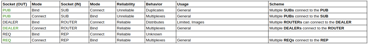 DEALER/ROUTER: reliable, asynchronous pair with backpressure (default choice);REQ/REP: reliable, synchronous pair (paranoid choice);PUB/SUB: unreliable, real-time pair (default choice for strict real-time operation or broadcasting).