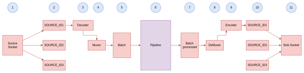 All streams processed by a single module instance are grouped into batches before processing. Batch is a concept used to optimize the computations on Nvidia hardware. Savant is implemented to hide batching: developers typically work with a single frame, not a batch of frames.